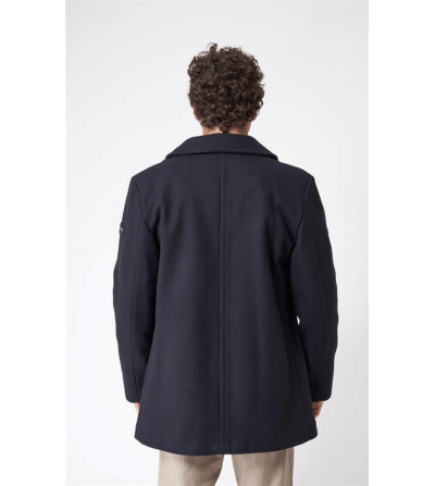 cierre de doble botonadura, bolsillos laterales y cuello con solapa. Paño hidrofugado. Un clásico de BATELA fabricado en lana y poliamida. El modelo mide 1,80m y lleva una talla M.